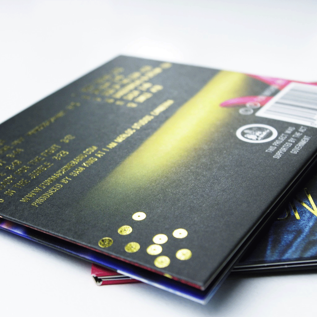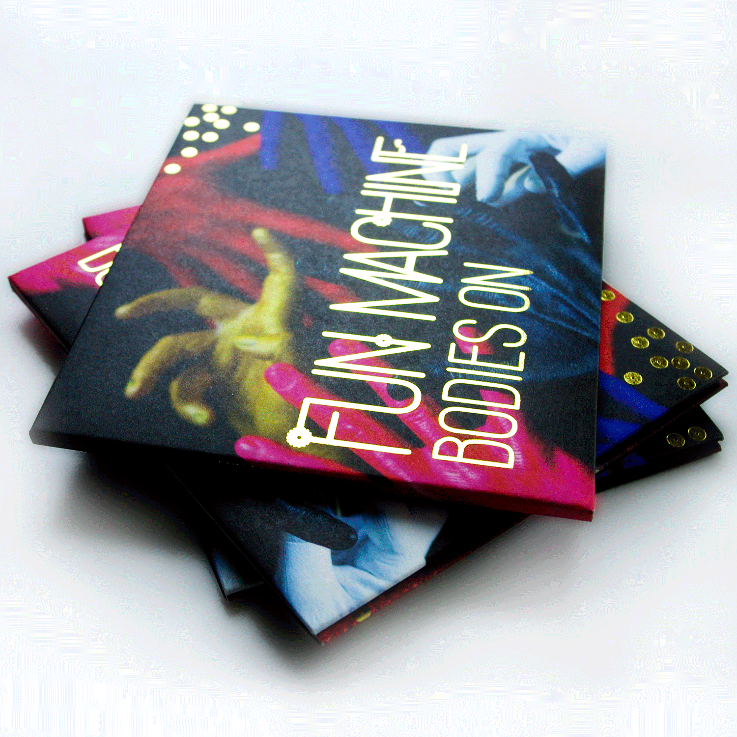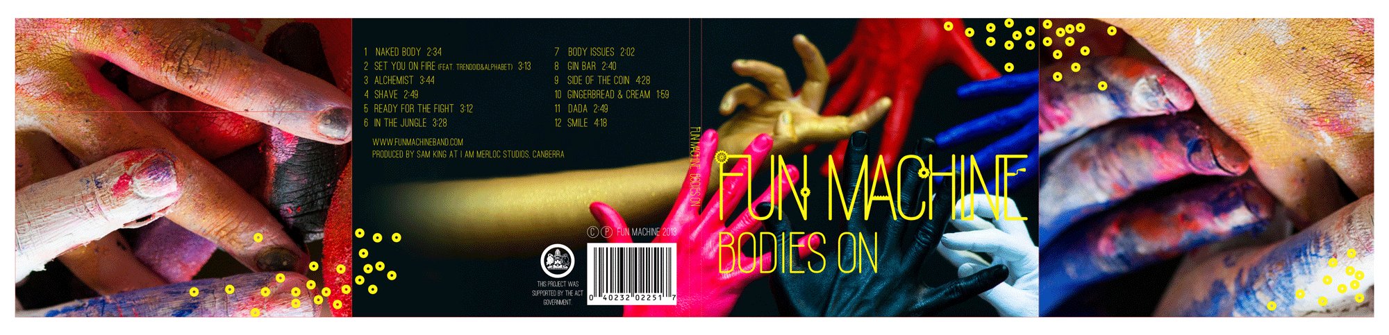 As an independent band, most of Fun Machineβs CDs would be sold at the merch table. They needed to be irresistible to pick up. I used a gorgeous raw card stock and combined it with metallic gold text and βsequinsβ, to give a delicious tactile experience. The sensuous closeup photos of the bandβs painted bodies are by one of Australiaβs top photographers Martin Ollman.
