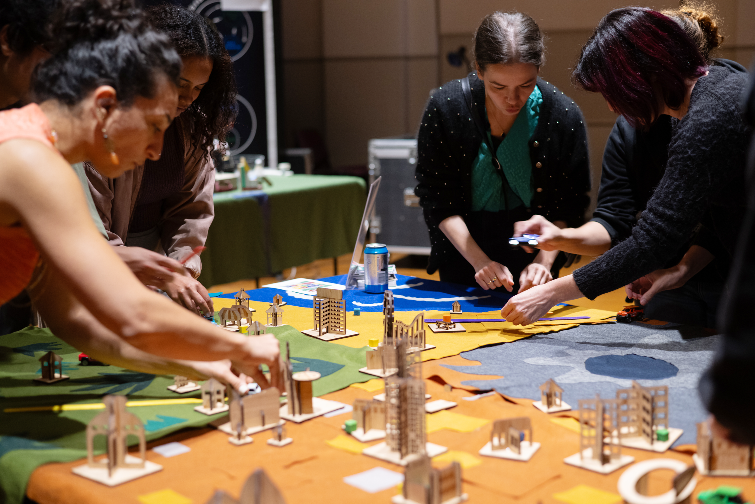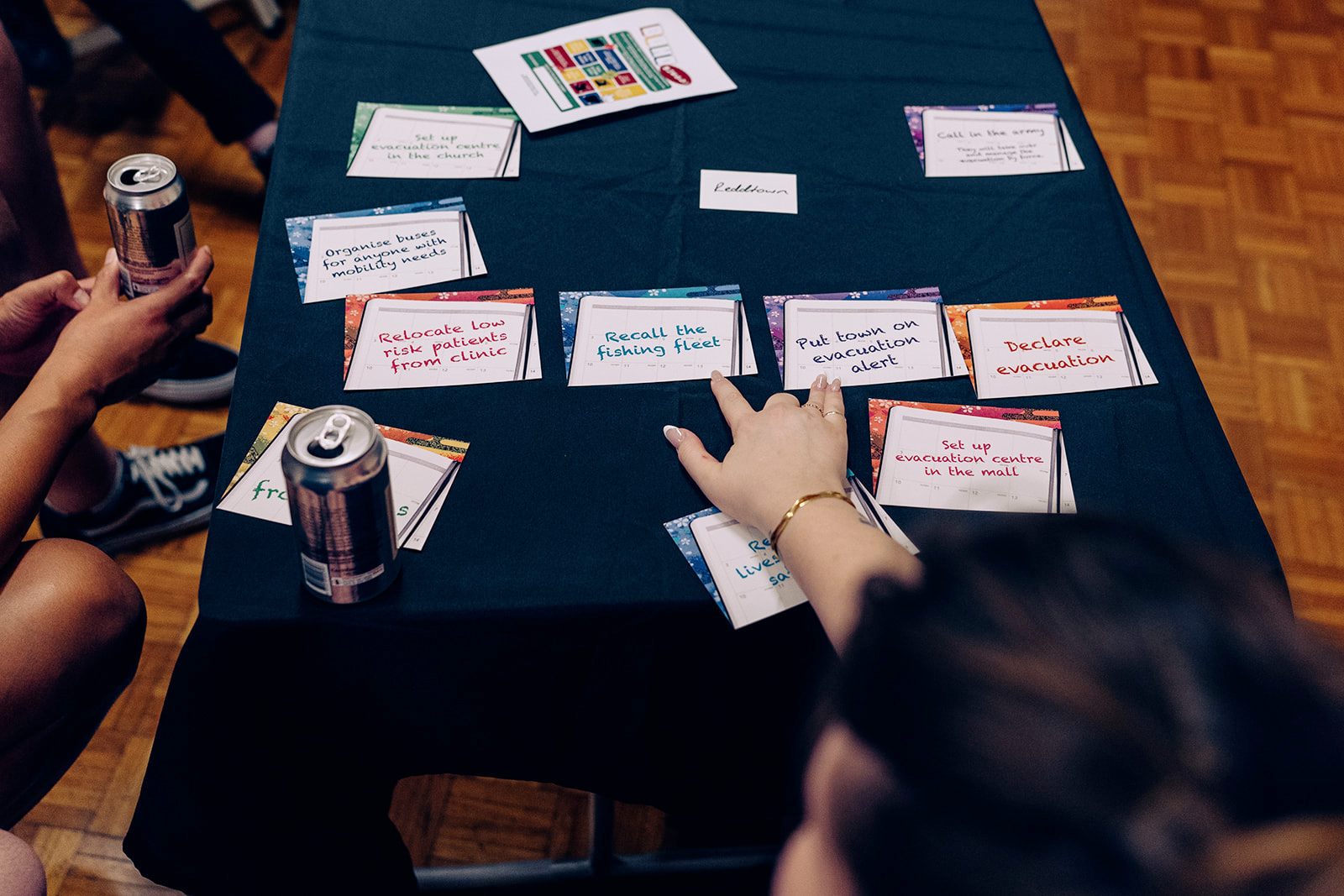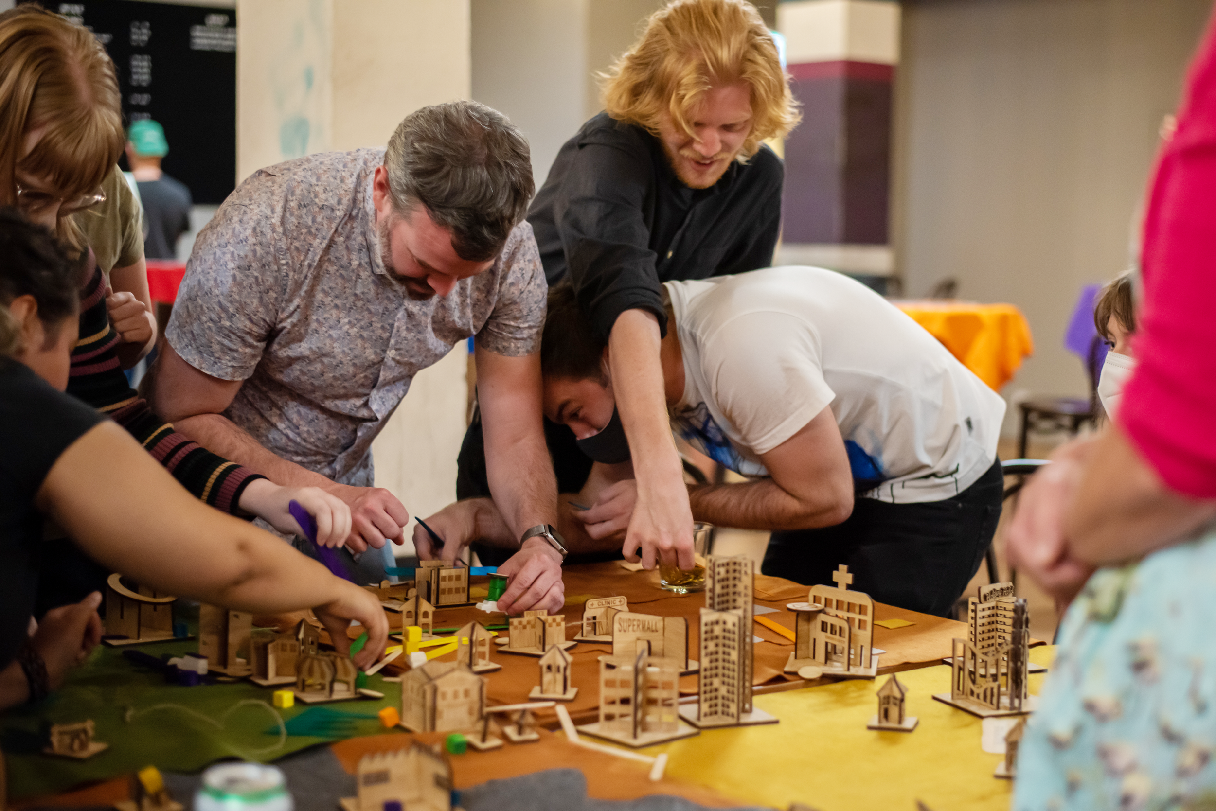 In this game, participants plan and build a city, then rescue their family from the perils created by their planning decisions.